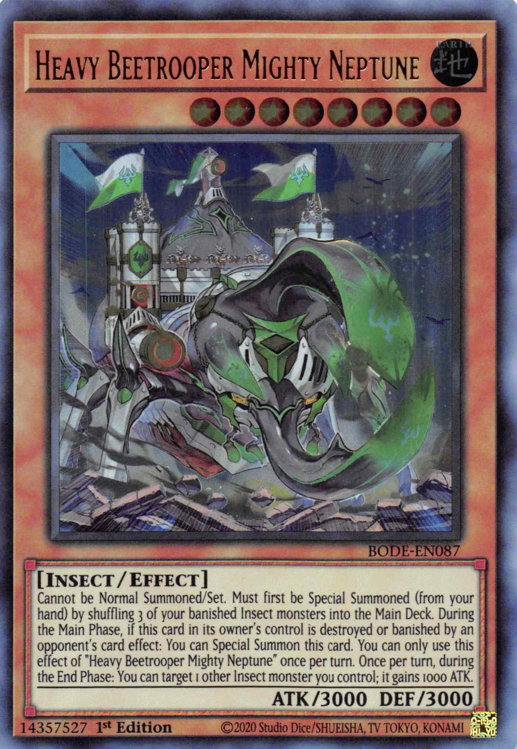 Cannot be Normal Summoned/Set. Must first be Special Summoned (from your hand) by shuffling 3 of your banished Insect monsters into the Main Deck. During the Main Phase, if this card in its owner's control is destroyed or banished by an opponent's card effect: You can Special Summon this card. You can only use this effect of "Heavy Beetrooper Mighty Neptune" once per turn. Once per turn, during the End Phase: You can target 1 other Insect monster you control; it gains 1000 ATK.