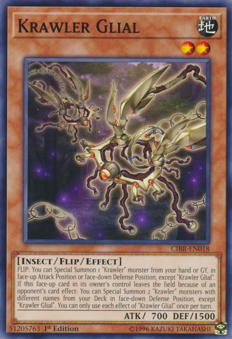 If this face-up card in its owner's control leaves the field because of an opponent's card effect: You can Special Summon 2 "Krawler" monsters with different names from your Deck in face-down Defense Position, except "Krawler Glial". You can only use each effect of "Krawler Glial" once per turn.