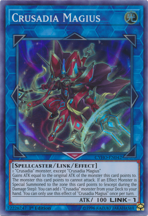 Gains ATK equal to the original ATK of the monster it points to. Monsters this card points to cannot attack. If an Effect Monster is Special Summoned to a zone this card points to: You can add 1 "Crusadia" monster from your Deck to your hand. You can only use this effect of “Crusadia Magius” once per turn.