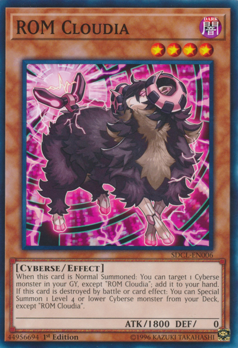 When this card is Normal Summoned: You can target 1 Cyberse monster in your GY, except "ROM Cloudia"; add it to your hand. If this card is destroyed by battle or card effect: You can Special Summon 1 Level 4 or lower Cyberse monster from your Deck, except "ROM Cloudia".