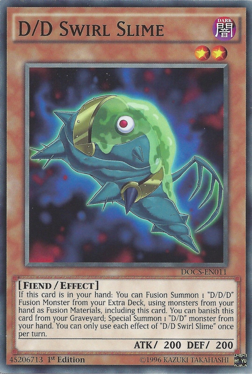 If this card is in your hand: You can Fusion Summon 1 "D/D/D" Fusion Monster from your Extra Deck, using monsters from your hand as Fusion Materials, including this card. You can banish this card from your Graveyard; Special Summon 1 "D/D" monster from your hand. You can only use each effect of "D/D Swirl Slime" once per turn.