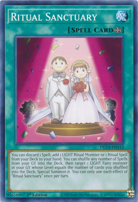 You can discard 1 Spell; add 1 LIGHT Ritual Monster or 1 Ritual Spell from your Deck to your hand. You can shuffle any number of Spells from your GY into the Deck, then target 1 LIGHT Fairy monster in your GY whose Level equals the number of cards you shuffled into the Deck; Special Summon it. You can only use each effect of "Ritual Sanctuary" once per turn.