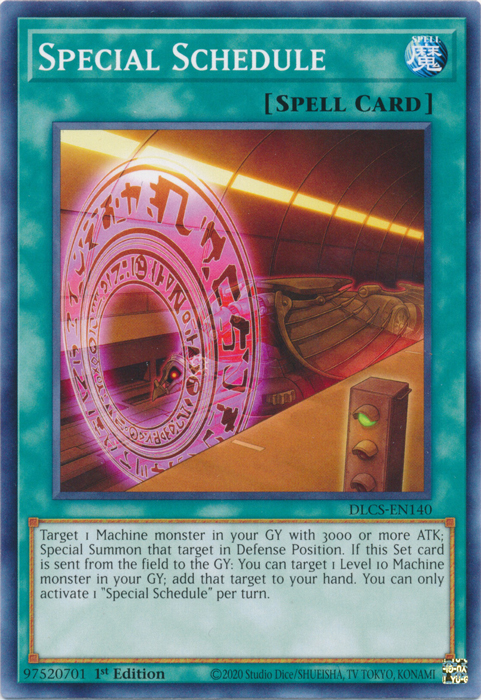 Target 1 Machine monster in your GY with 3000 or more ATK; Special Summon that target in Defense Position. If this Set card is sent from the field to the GY: You can target 1 Level 10 Machine monster in your GY; add that target to your hand. You can only activate 1 "Special Schedule" per turn.