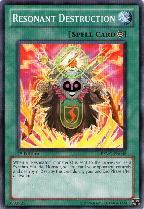 When a Resonator monster(s) is sent to the graveyard as a Synchro Material Monster, select 1 card your opponent controls and destroy it. Destroy this card during your 2ns End Phase after activation.