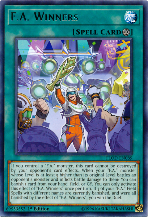 If you control a “F.A.” monster, this card cannot be destroyed by your opponent’s card effects. When your “F.A.” monster whose Level is at least 5 higher than it’s original Level battles an opponent’s monster and inflicts battle damage to them: banish 1 card from your hand, field or GY. You can only activate this effect of “F.A. Winners” once per turn. If 3 of your “F.A” Field Spells with different names are currently banished, and were all banished by the effect of “F.A. Winners”, you win the Duel.