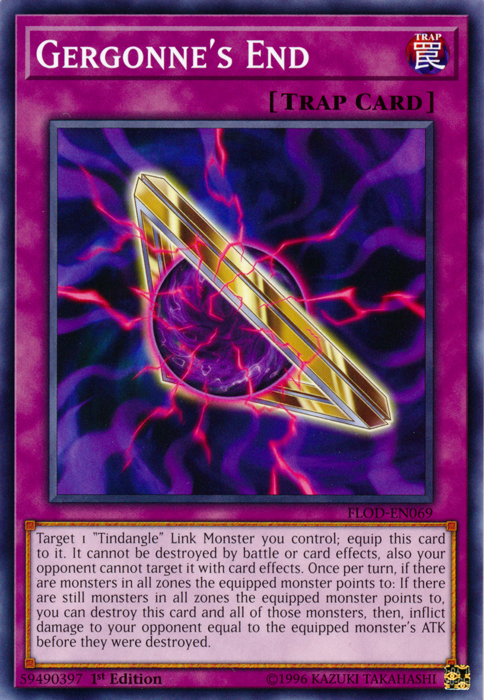 Target 1 "Tindangle" Link Monster you control; equip it with this card. It cannot be destroyed by battle or card effects, also your opponent cannot target it with card effects. Once per turn, if there is a monster in every zone the equipped monster points to: You can destroy this card and as many of those monsters as possible, then if all of them were destroyed, inflict damage to your opponent equal to the ATK of the monster that was equipped with this card.