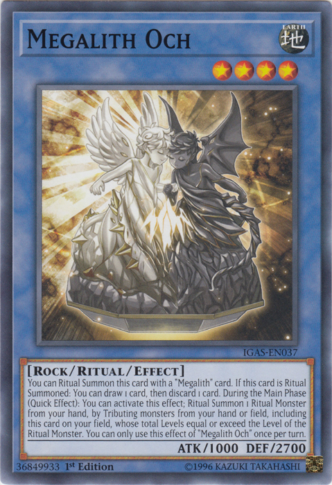You can Ritual Summon this card with a "Megalith" card. If this card is Ritual Summoned: You can draw 1 card, then discard 1 card. During the Main Phase (Quick Effect): You can activate this effect; Ritual Summon 1 Ritual Monster from your hand, by Tributing monsters from your hand or field, including this card on your field, whose total Levels equal or exceed the Level of the Ritual Monster. You can only use this effect of "Megalith Och" once per turn.