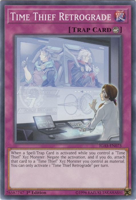 When a Spell/Trap Card is activated while you control a "Time Thief" Xyz Monster: Negate the activation, and if you do, attach that card to a "Time Thief" Xyz Monster you control as material. You can only activate 1 "Time Thief Retrograde" per turn.