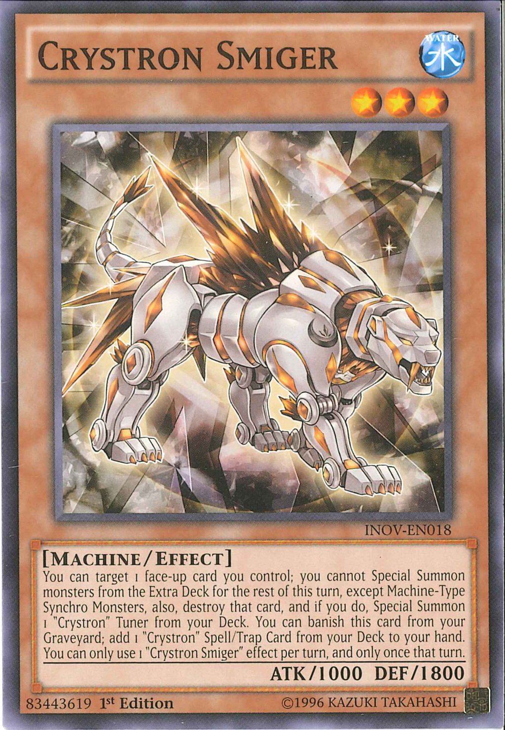 You can target 1 face-up card you control; you cannot Special Summon monsters from the Extra Deck for the rest of this turn, except Machine-Type Synchro Monsters, also destroy that card, and if you do, Special Summon 1 "Crystron" Tuner from your Deck. You can banish this card from your Graveyard; add 1 "Crystron" Spell/Trap Card from your Deck to your hand. You can only use 1 "Crystron Smiger" effect per turn, and only once that turn.
