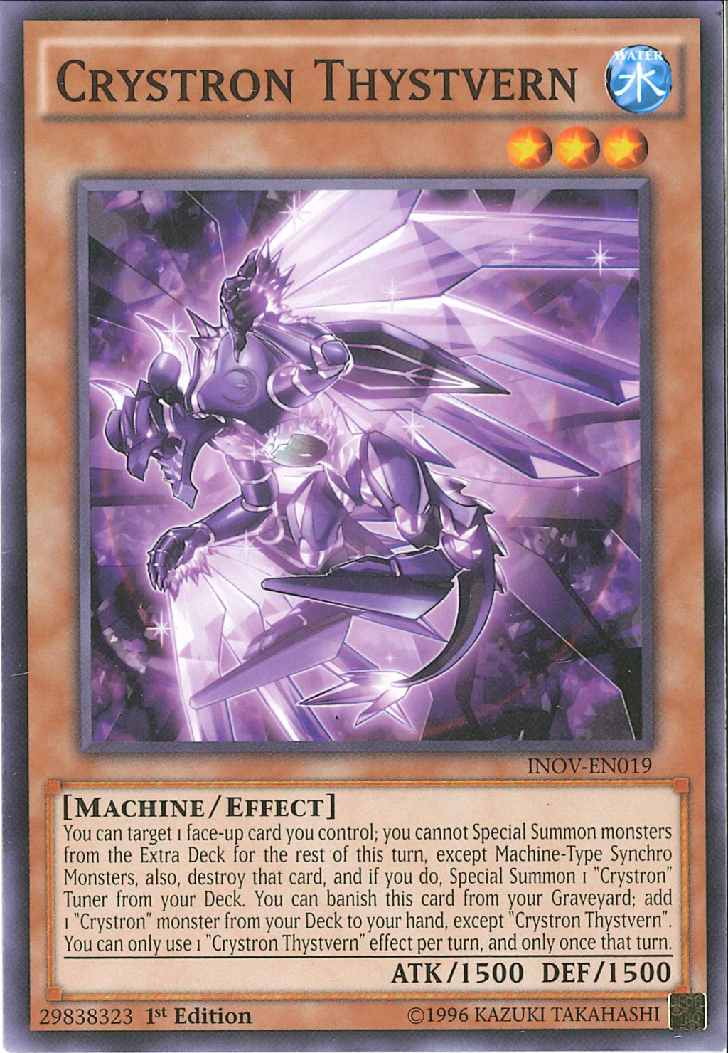 You can target 1 face-up card you control; you cannot Special Summon monsters from the Extra Deck for the rest of this turn, except Machine-Type Synchro Monsters, also destroy that card, and if you do, Special Summon 1 "Crystron" Tuner from your Deck. You can banish this card from your Graveyard; add 1 "Crystron" monster from your Deck to your hand, except "Crystron Thystvern". You can only use 1 "Crystron Thystvern" effect per turn, and only once that turn.