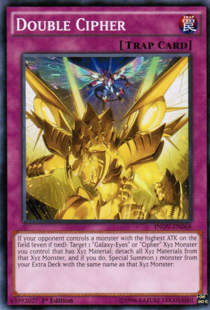 If your opponent controls a monster with the highest ATK on the field (even if tied): Target 1 "Galaxy-Eyes" or "Cipher" Xyz Monster you control that has Xyz Material; detach all Xyz Materials from that Xyz Monster, and if you do, Special Summon 1 monster from your Extra Deck with the same name as that Xyz Monster.