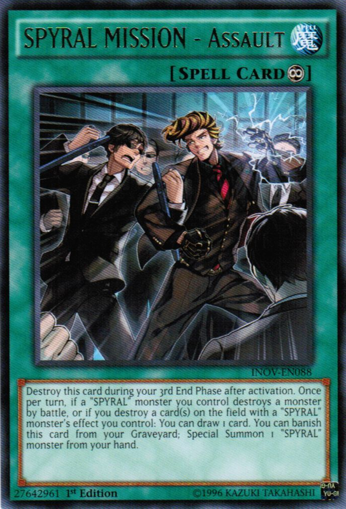Destroy this card during your 3rd End Phase after activation. Once per turn, if a "SPYRAL" monster you control destroys a monster by battle, or if you destroy a card(s) on the field with a "SPYRAL" monster's effect you control: You can draw 1 card. You can banish this card from your Graveyard; Special Summon 1 "SPYRAL" monster from your hand.