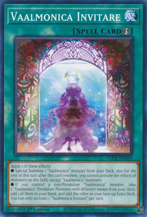 • If you control a non-Pendulum "Vaalmonica" monster, take 2 "Vaalmonica" Pendulum Monsters with different names from your Deck, add 1 of them to your hand, and add the other to your face-up Extra Deck.