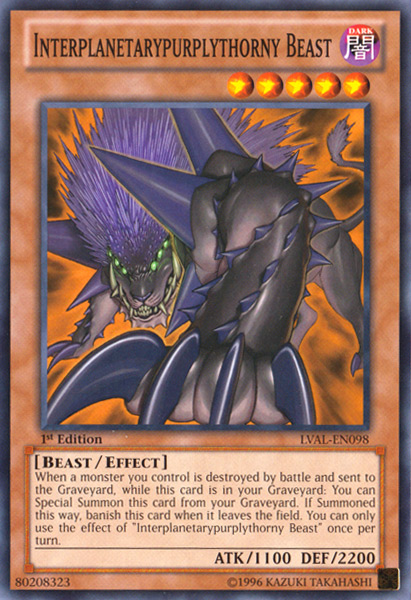 When a monster you control is destroyed by battle and sent to the Graveyard, while this card is in the Graveyard: You can Special Summon this card from your Graveyard. If you do, banish it when it leaves the field. You can only use the effect of "Interplanetarypurplythorny Beast" once per turn.
