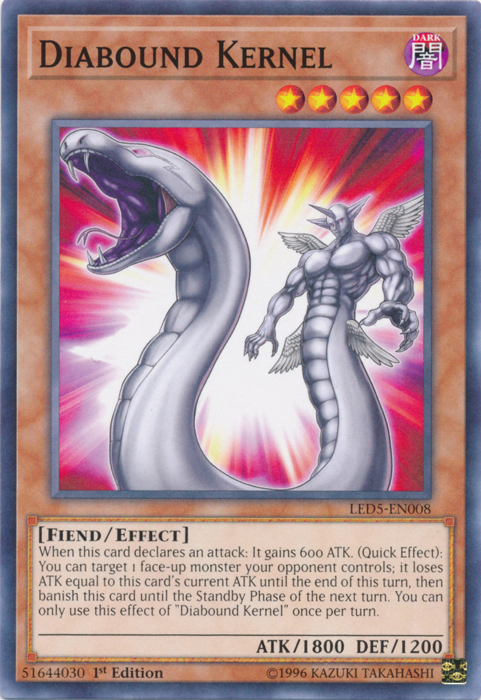 When this card declares an attack: It gains 600 ATK. During your player's turn: You can target 1 face-up monster your opponent controls; Loses it ATK equal to this card's ATK current up to the end of this turn, Then banish this card up to the Standby Phase of the next turn. You can only use this effect of "Diabound Kernel" once per turn .