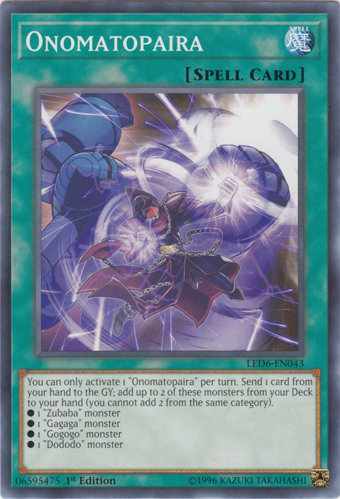 You can only activate 1 "Onomatopaira" per turn. Send 1 card from your hand to the Graveyard; add up to 2 of these monsters from your Deck to your hand (you cannot add 2 from the same category).