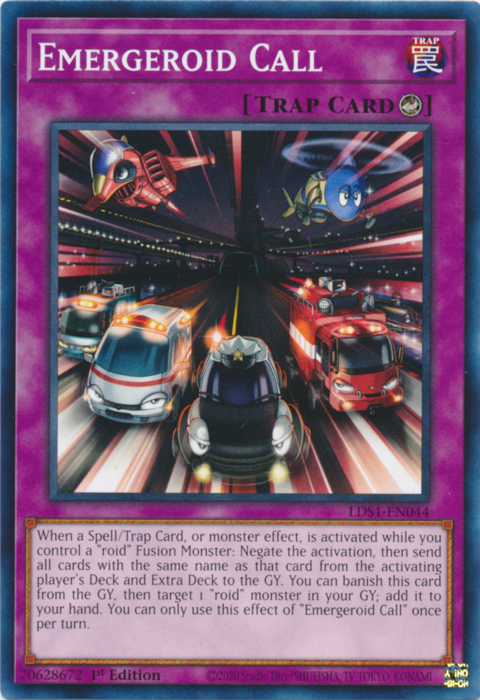 When a Spell/Trap Card, or monster effect, is activated while you control a "roid" Fusion Monster: Negate the activation, then send all cards with the same name as that card from the activating player's Deck and Extra Deck to the GY. You can banish this card from the GY, then target 1 "roid" monster in your GY; add it to your hand. You can only use this effect of "Emergeroid Call" once per turn.