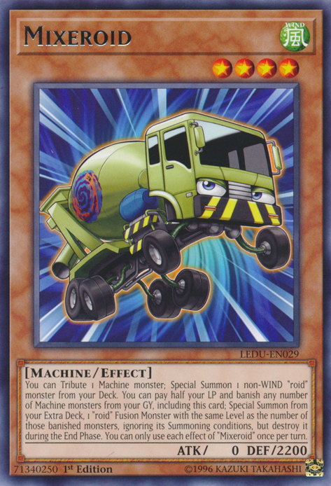You can Tribute 1 Machine monster; Special Summon 1 non-WIND "roid" monster from your Deck. You can pay half your LP and banish any number of Machine monsters from your GY, including this card; Special Summon from your Extra Deck, 1 "roid" Fusion Monster with the same Level as the number of those banished monsters, ignoring its Summoning conditions, but destroy it during the End Phase. You can only use each effect of "Mixeroid" once per turn.
