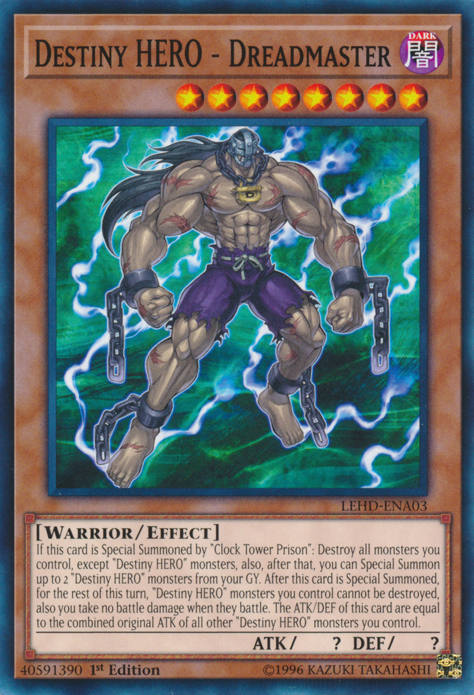 If this card is Special Summoned by "Clock Tower Prison": Destroy all monsters you control, except "Destiny HERO" monsters, also, after that, you can Special Summon up to 2 "Destiny HERO" monsters from your GY. After this card is Special Summoned, for the rest of this turn, "Destiny HERO" monsters you control cannot be destroyed, also you take no battle damage when they battle. The ATK/DEF of this card are equal to the combined original ATK of all other "Destiny HERO" monsters you control.