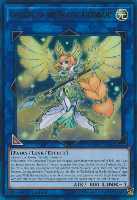 If this card is Link Summoned: You can banish up to 3 cards from your hand and/or field, and if you do, Special Summon that many "Nordic" monsters from your Deck in Defense Position, also, for the rest of this turn, you cannot Special Summon monsters, except "Aesir" monsters, nor Normal Summon/Set any monsters. You can only use this effect of "Gullveig of the Nordic Ascendant" once per turn. While this card points to an "Aesir" monster, your opponent cannot target that monster with card effects, also monsters your opponent controls cannot target this card for attacks.