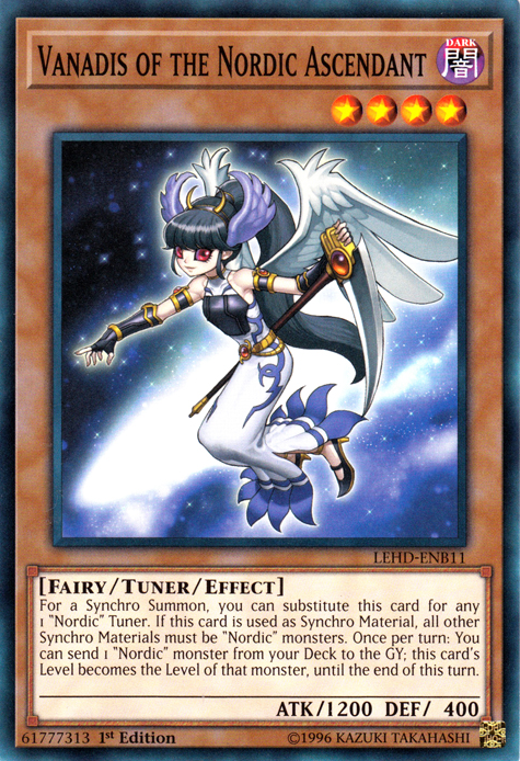 For a Synchro Summon, you can substitute this card for any 1 "Nordic" Tuner. If this card is used as Synchro Material, all other Synchro Materials must be "Nordic" monsters. Once per turn: You can send 1 "Nordic" monster from your Deck to the GY; this card's Level becomes the Level of that monster, until the end of this turn.