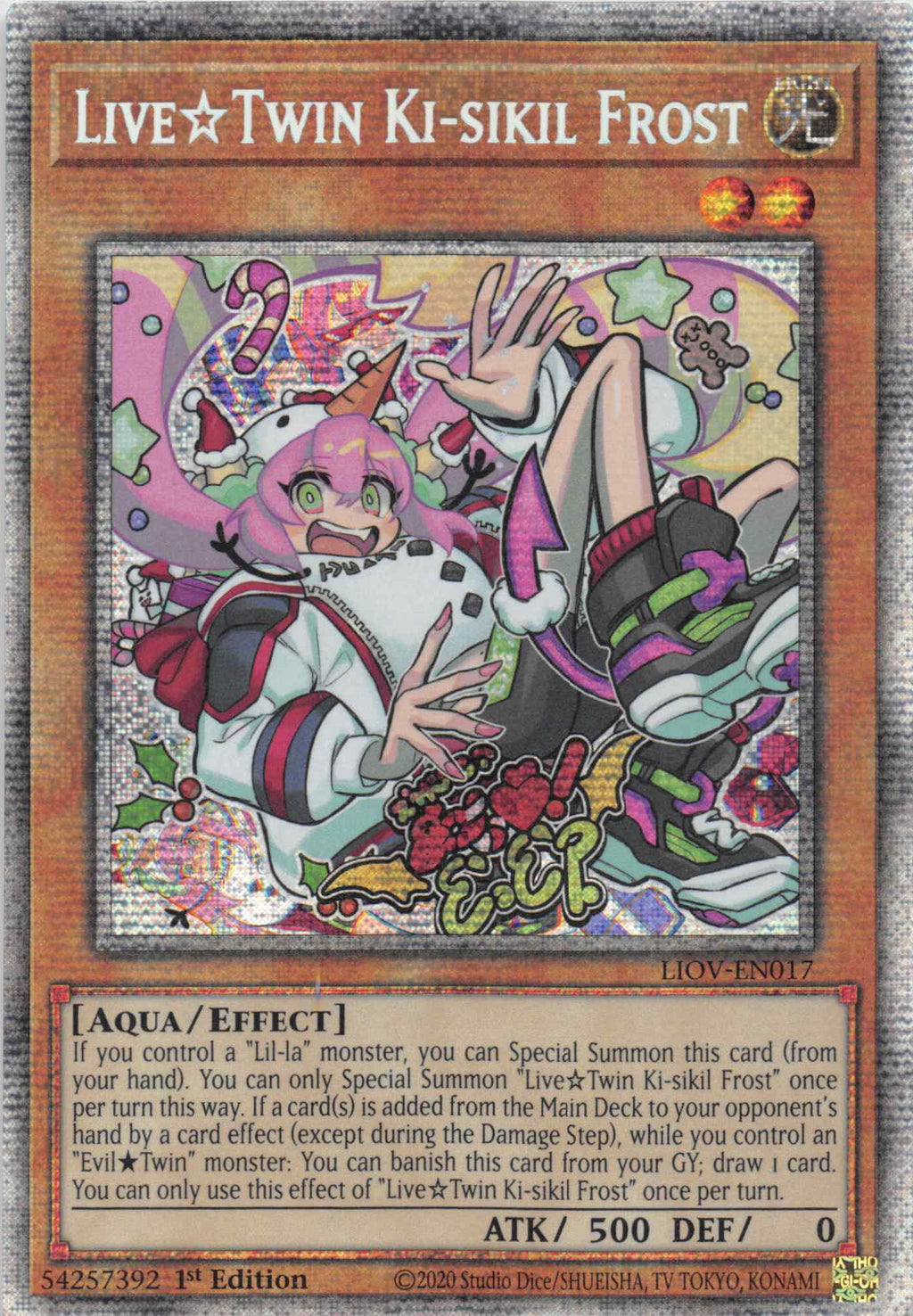If you control a "Lil-la" monster, you can Special Summon this card (from your hand). You can only Special Summon "Live Twin Ki-sikil Frost" once per turn this way. If a card(s) is added from the Main Deck to your opponent's hand by a card effect (except during the Damage Step), while you control an "Evil Twin" monster: You can banish this card from your GY; draw 1 card. You can only use this effect of "Live Twin Ki-sikil Frost" once per turn.