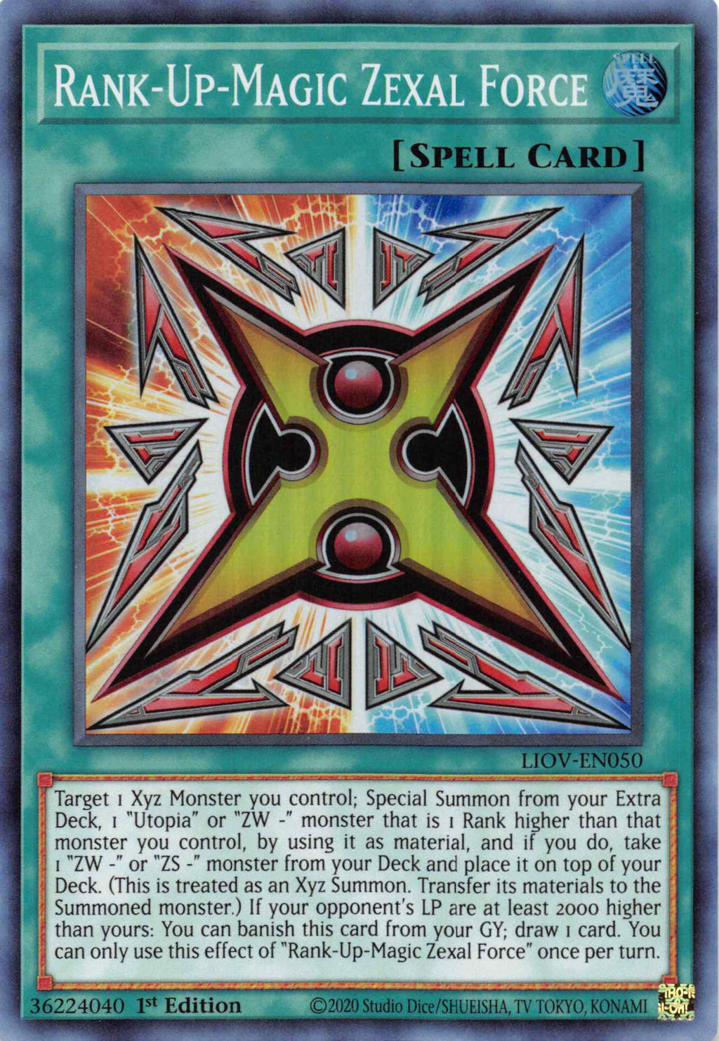 Target 1 Xyz Monster you control; Special Summon from your Extra Deck, 1 "Utopia" or "ZW -" monster that is 1 Rank higher than that monster you control, by using it as material, and if you do, take 1 "ZW -" or "ZS -" monster from your Deck and place it on top of your Deck. (This is treated as an Xyz Summon. Transfer its materials to the Summoned monster.) If your opponent's LP are at least 2000 higher than yours: You can banish this card from your GY; draw 1 card. You can only use this effect of "Rank-Up-Magic Zexal Force" once per turn.