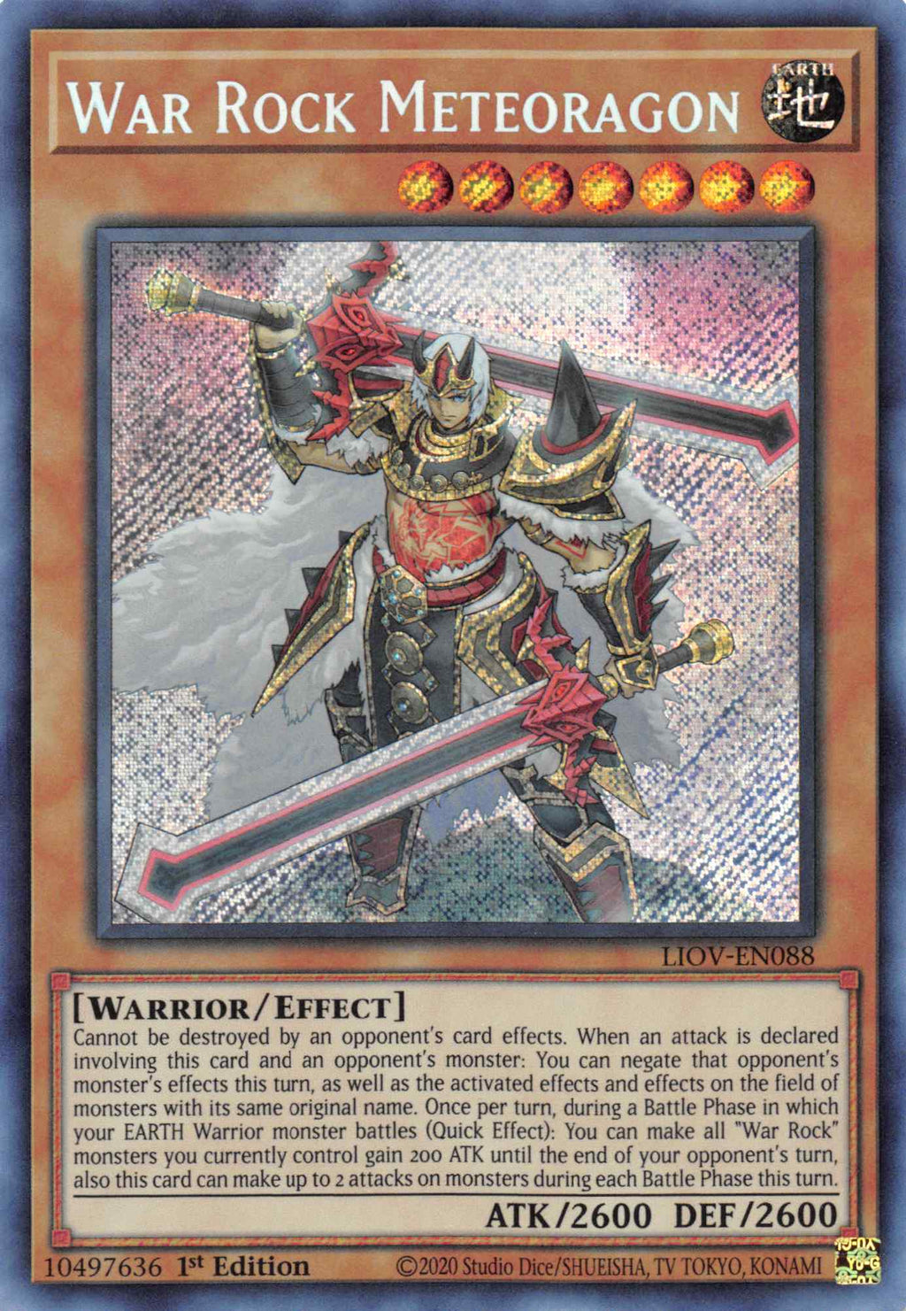 Cannot be destroyed by an opponent's card effects. When an attack is declared involving this card and an opponent's monster: You can negate that opponent's monster's effects this turn, as well as the activated effects and effects on the field of monsters with its same original name. Once per turn, during a Battle Phase in which your EARTH Warrior monster battles (Quick Effect): You can make all "War Rock" monsters you currently control gain 200 ATK until the end of your opponent's turn, also this card can make up to 2 attacks on monsters during each Battle Phase this turn.