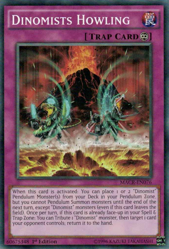 When this card is activated: You can place 1 or 2 "Dinomist" Pendulum Monster(s) from your Deck in your Pendulum Zone, but you cannot Pendulum Summon monsters until the end of the next turn, except "Dinomist" monsters (even if this card leaves the field). Once per turn, if this card is already face-up in your Spell & Trap Zone: You can Tribute 1 "Dinomist" monster, then target 1 card your opponent controls; return it to the hand.