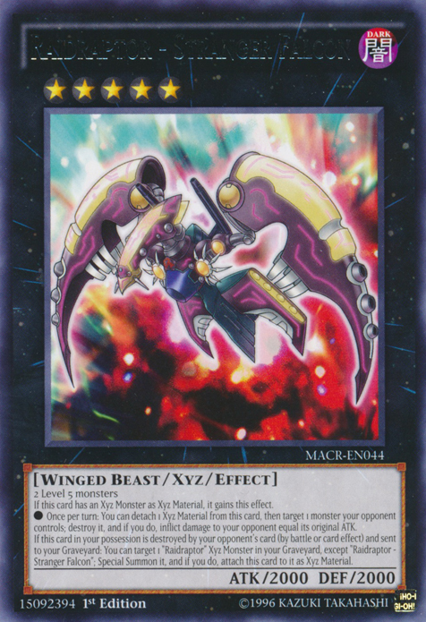 If this card in your possession is destroyed by your opponent's card (by battle or card effect) and sent to your Graveyard: You can target 1 "Raidraptor" Xyz Monster in your Graveyard, except "Raidraptor - Stranger Falcon"; Special Summon it, and if you do, attach this card to it as Xyz Material.