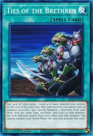 Pay 2000 LP, then target 1 Level 4 or lower monster you control; for the rest of this turn after this card resolves, you cannot Special Summon monsters, also Special Summon 2 monsters from your Deck, with the same Type, Attribute, and Level as that monster, but with different names from each other and that monster. You cannot conduct your Battle Phase the turn you activate this card.