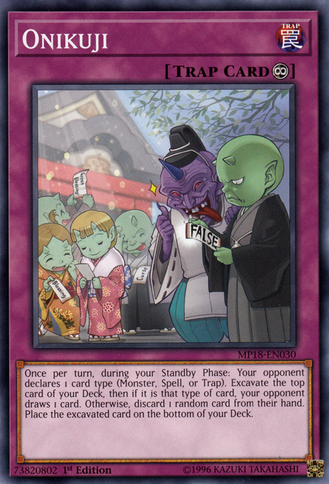Once per turn, during your Standby Phase: Your opponent declares 1 card type (Monster, Spell, or Trap). Excavate the top card of your Deck, then if it is that type of card, your opponent draws 1 card. Otherwise, discard 1 random card from their hand. Place the excavated card on the bottom of your Deck.