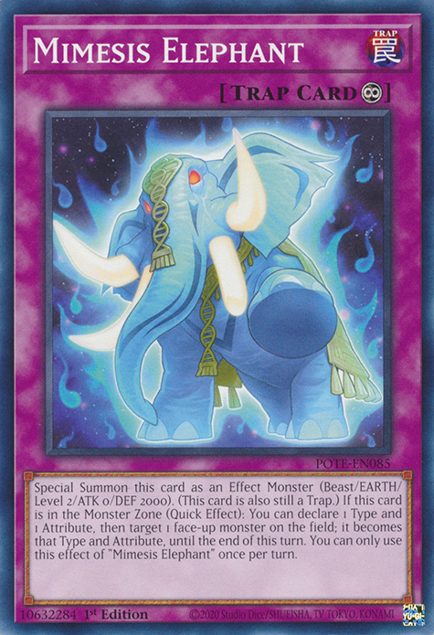 Special Summon this card as an Effect Monster (Beast/EARTH/Level 2/ATK 0/DEF 2000). (This card is also still a Trap.) If this card is in the Monster Zone (Quick Effect): You can declare 1 Type and 1 Attribute, then target 1 face-up monster on the field; it becomes that Type and Attribute, until the end of this turn. You can only use this effect of "Mimesis Elephant" once per turn.