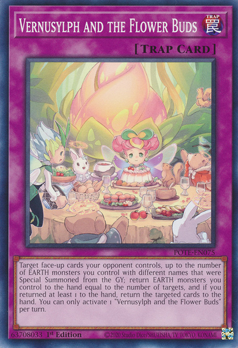 Target face-up cards your opponent controls, up to the number of EARTH monsters you control with different names that were Special Summoned from the GY; return EARTH monsters you control to the hand equal to the number of targets, and if you returned at least 1 to the hand, return the targeted cards to the hand. You can only activate 1 "Vernusylph and the Flower Buds" per turn.