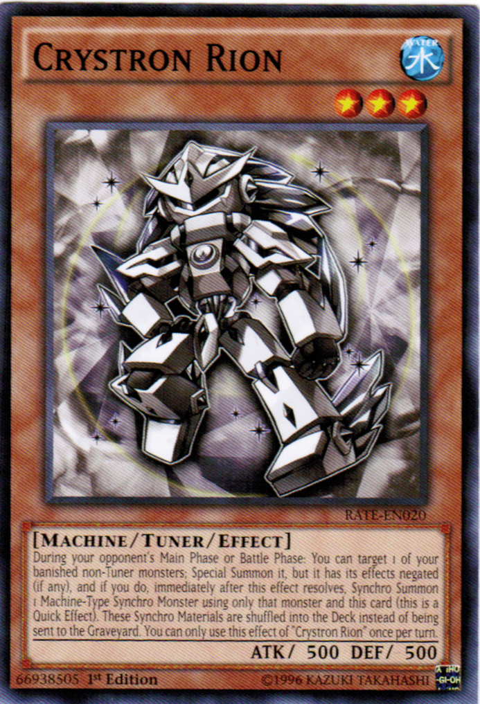 During your opponent's Main Phase or Battle Phase: You can target 1 of your banished non-Tuner monsters; Special Summon it, but it has its effects negated (if any), and if you do, immediately after this effect resolves, Synchro Summon 1 Machine-Type Synchro Monster using only that monster and this card (this is a Quick Effect). These Synchro Materials are shuffled into the Deck instead of being sent to the Graveyard. You can only use this effect of "Crystron Rion" once per turn.
