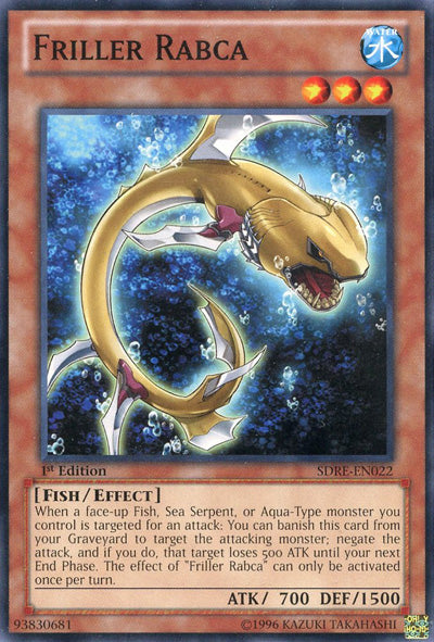 When a face-up Fish, Sea Serpent, or Aqua-Type monster you control is targeted for an attack: You can banish this card from your Graveyard to target the attacking monster; negate the attack, and that target loses 500 ATK until your next End Phase. The effect of "Friller Rabca" can only be activated once per turn.