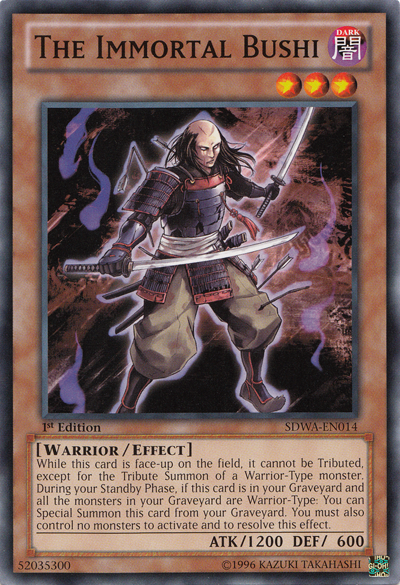 This card cannot be Tributed, except for the Tribute Summon of a Warrior-Type monster. During your Standby Phase, if this card is in your Graveyard and you control no monsters, you can Special Summon it. You cannot activate this effect if there are any monsters in your Graveyard that are not Warrior-Type.