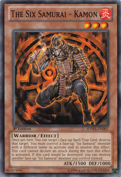 Once per turn: You can target 1 face-up Spell/Trap Card; destroy that target. You must control another "Six Samurai" monster with a different name to activate and to resolve this effect. This monster cannot declare an attack during the turn this effect is used. If this card would be destroyed, you can destroy another face-up "Six Samurai" monster you control instead.