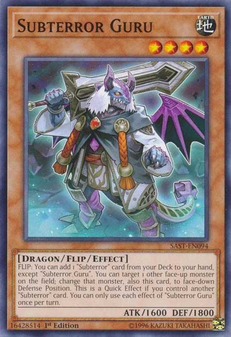 FLIP: You can add 1 "Subterror" card from your Deck to your hand, except "Subterror Guru". You can target 1 other face-up monster on the field; change that monster, also this card, to face-down Defense Position. This is a Quick Effect if you control another "Subterror" card. You can only use each effect of "Subterror Guru" once per turn.