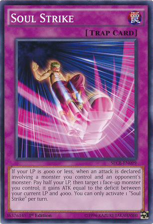 If your LP is 4000 or less, when an attack is declared involving a monster you control and an opponent's monster: Pay half your LP, then target 1 face-up monster you control; it gains ATK equal to the deficit between your current LP and 4000. You can only activate 1 "Soul Strike" per turn.