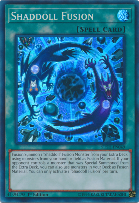 Fusion Summon 1 "Shaddoll" Fusion Monster from your Extra Deck, using monsters from your hand or field as Fusion Material. If your opponent controls a monster that was Special Summoned from the Extra Deck, you can also use monsters in your Deck as Fusion Material. You can only activate 1 "Shaddoll Fusion" per turn.