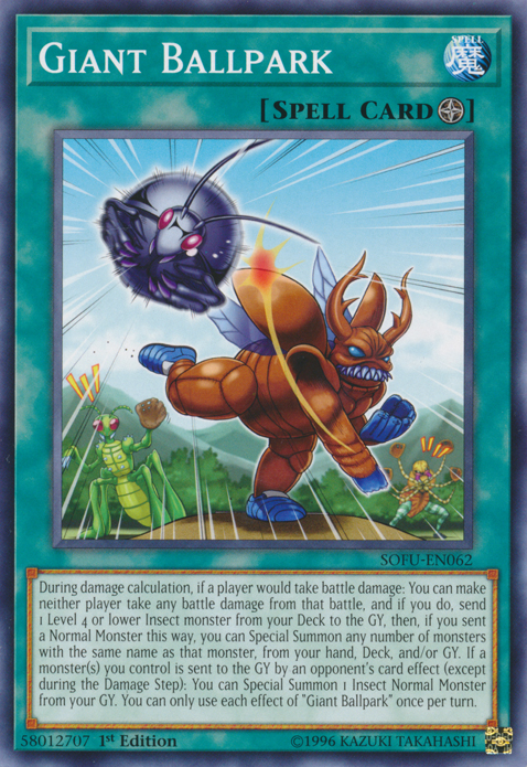 During damage calculation: You can make the battle damage that both players receive from that battle becomes 0, and if you do, you can send 1 Level 4 or lower Insect monster from your Deck to the GY, then, if the monster you sent was a Normal Monster, you can Special Summon any number of cards with the same name as that monster from your hand, Deck, and/or GY. If a monster you control is sent to the GY by an opponent’s card effect: You can Special Summon 1 Insect Normal Monster from your GY. You can only use each effect of "Giant Ballpark" only once per turn.