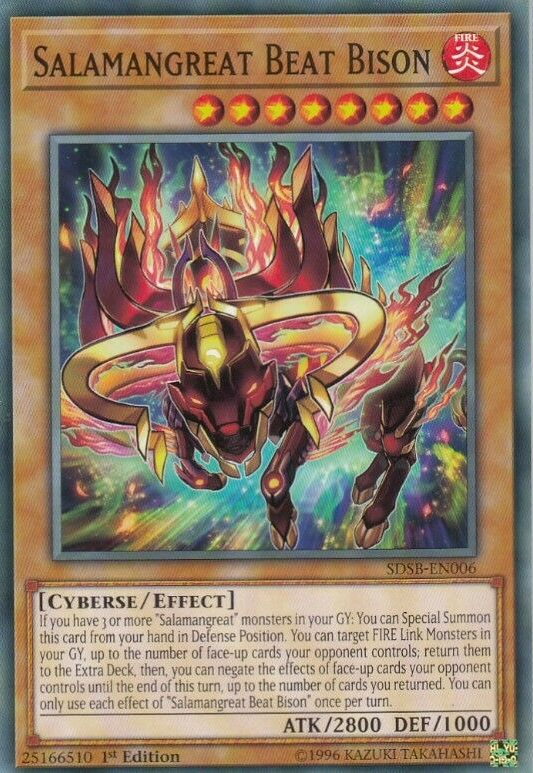 If you have 3 or more "Salamangreat" monsters in your GY: You can Special Summon this card from your hand in Defense Position. You can target FIRE Link Monsters in your GY, up to the number of face-up cards your opponent controls; return them to the Extra Deck, then, you can negate the effects of face-up cards your opponent controls until the end of this turn, up to the number of cards you returned. You can only use each effect of "Salamangreat Beat Bison" once per turn.