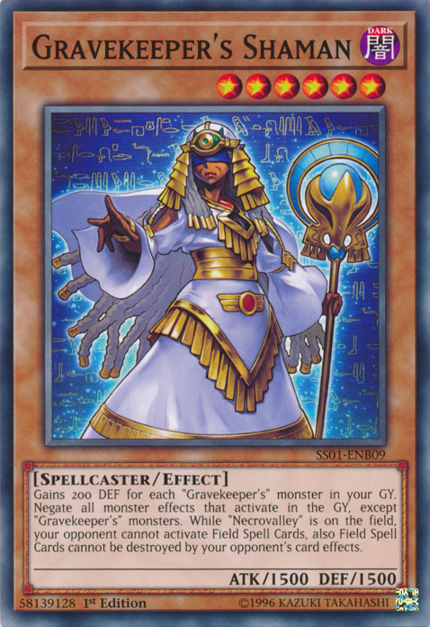 This card gains 200 DEF for each "Gravekeeper's" monster in your Graveyard. Negate all monster effects that activate in the Graveyard, except "Gravekeeper's" monsters. While "Necrovalley" is on the field, your opponent cannot activate Field Spell Cards, also Field Spell Cards on the field cannot be destroyed by your opponent's card effects.