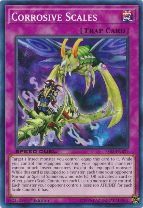 Target 1 Insect monster you control; equip this card to it. While you control the equipped monster, your opponent's monsters cannot attack Insect monsters, except the equipped monster. While this card is equipped to a monster, each time your opponent Normal or Special Summons a monster(s), OR activates a card or effect, place 1 Scale Counter on each face-up monster they control. Each monster your opponent controls loses 100 ATK/DEF for each Scale Counter it has.