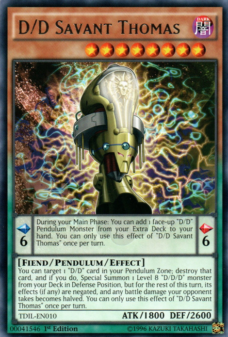 You can target 1 "D/D" card in your Pendulum Zone; destroy that card, and if you do, Special Summon 1 Level 8 "D/D/D" monster from your Deck in Defense Position, but for the rest of this turn, its effects (if any) are negated, and any battle damage your opponent takes becomes halved. You can only use this effect of "D/D Savant Thomas" once per turn.