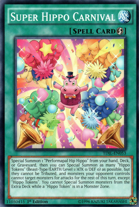 Special Summon 1 "Performapal Hip Hippo" from your hand, Deck, or Graveyard, then you can Special Summon as many "Hippo Tokens" (Beast-Type/EARTH/Level 1/ATK 0/DEF 0) as possible, but they cannot be Tributed, and monsters your opponent controls cannot target monsters for attacks for the rest of this turn, except "Hippo Tokens". You cannot Special Summon monsters from the Extra Deck while a "Hippo Token" is in a Monster Zone.