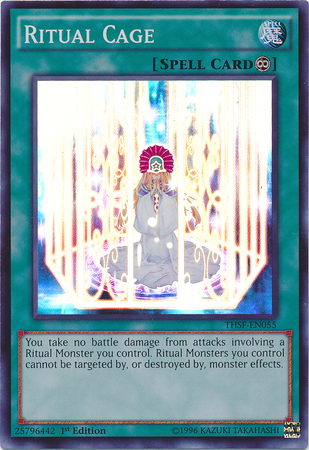 You take no Battle Damage from battles involving a face-up Ritual Monster you control. Also, face-up Ritual Monsters you control cannot be targeted or destroyed by the effects of Effect Monsters.