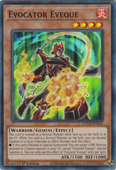 • If this card is Normal or Special Summoned: You can target 1 FIRE Warrior monster or 1 Gemini monster in your GY, except "Evocator Eveque"; Special Summon it. You can only use this effect of "Evocator Eveque" once per turn.