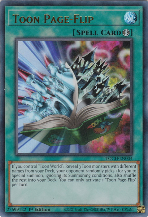 If you control "Toon World": Reveal 3 Toon monsters with different names from your Deck, your opponent randomly picks 1 for you to Special Summon, ignoring its Summoning conditions, also shuffle the rest into your Deck. You can only activate 1 "Toon Page-Flip" per turn.